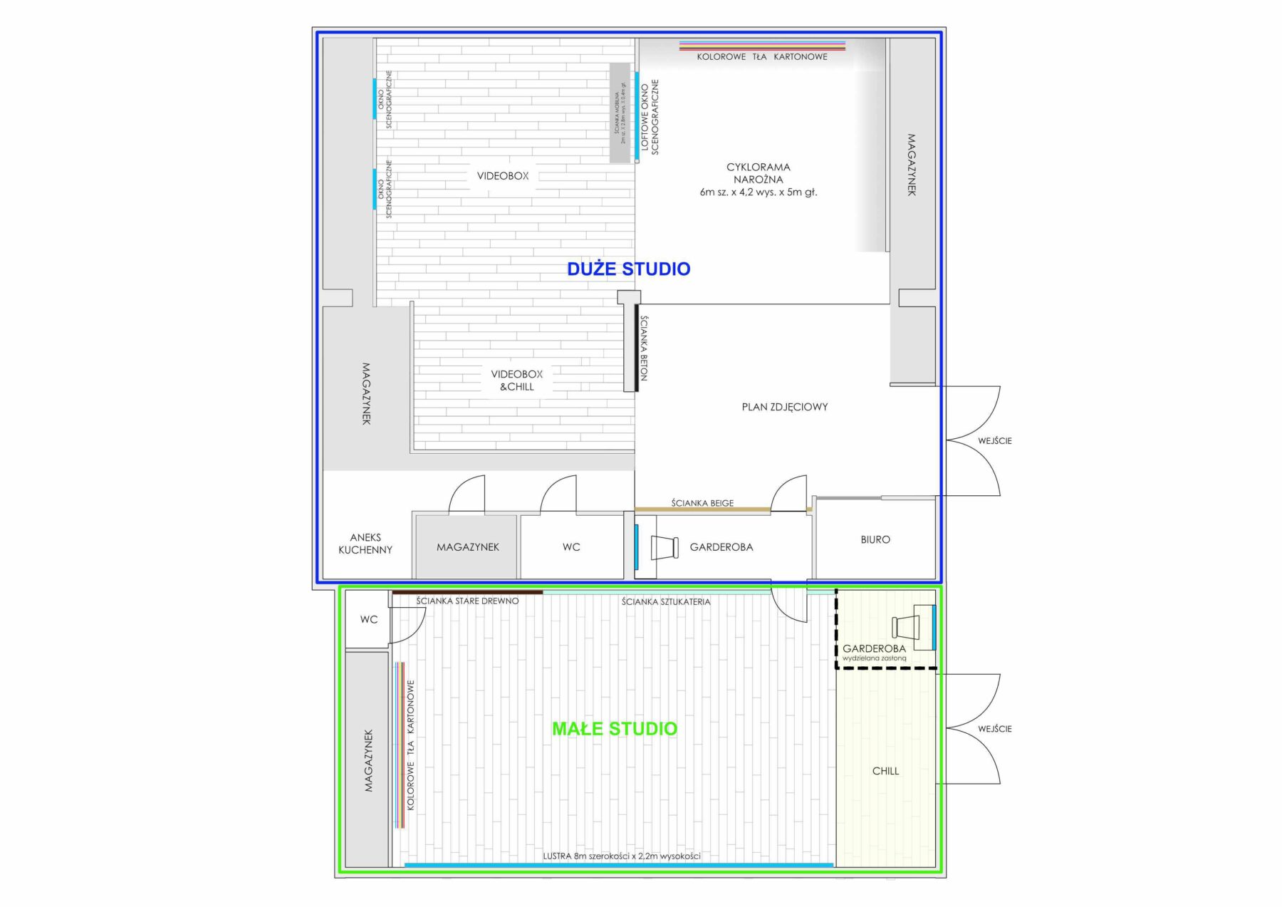 DUŻE STUDIO 150m² – 7 metrowa narożna cyklorama, Tła kartonowe, Greenbox, Videobox – Aranżacja mieszkania 30m²