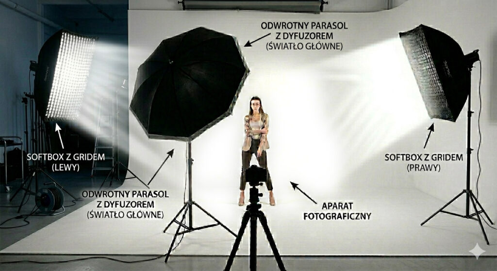 1. Światło Kluczowe (Model): Parasol Odwrotny z Dyfuzorem Zaczynamy od ustawienia największej lampy, która oświetli naszego modela. Parasol odwrotny z dyfuzorem daje przepiękne, bardzo miękkie, wręcz „otulające” światło. To klucz do uzyskania efektu „bezcieniowego” na skórze i ubraniach.
